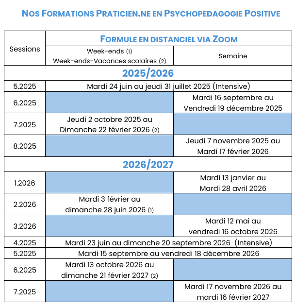 Nos formations sont dispensées en distanciel ainsi qu’en présentiel. Tous les modules sont construits autour du concept de la psychopédagogie positive.