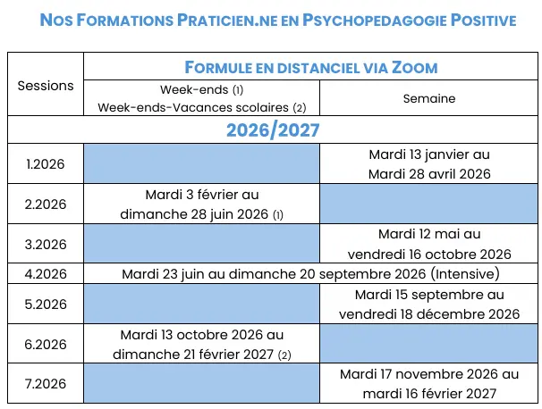 Nos formations sont dispensées en distanciel ainsi qu’en présentiel. Tous les modules sont construits autour du concept de la psychopédagogie positive.