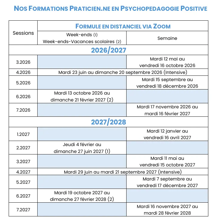 Cette réunion permet d’expliquer également les modalités pratiques à l’obtention de la certification de praticien.ne en psychopédagogie positive.